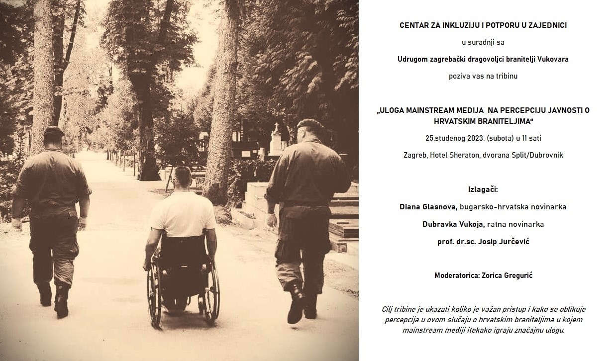 U dvorani Split/Dubrovnik hotela Sheraton u Zagrebu (25. studenog 2023.) održana je tribina “Uloga mainstream medija na percepciju javnosti o hrvatskim braniteljima” koje je organizirao Centar za potporu i inkluziju u zajednici u suradnji s Udrugom zagrebački dragovoljci branitelji Vukovara.